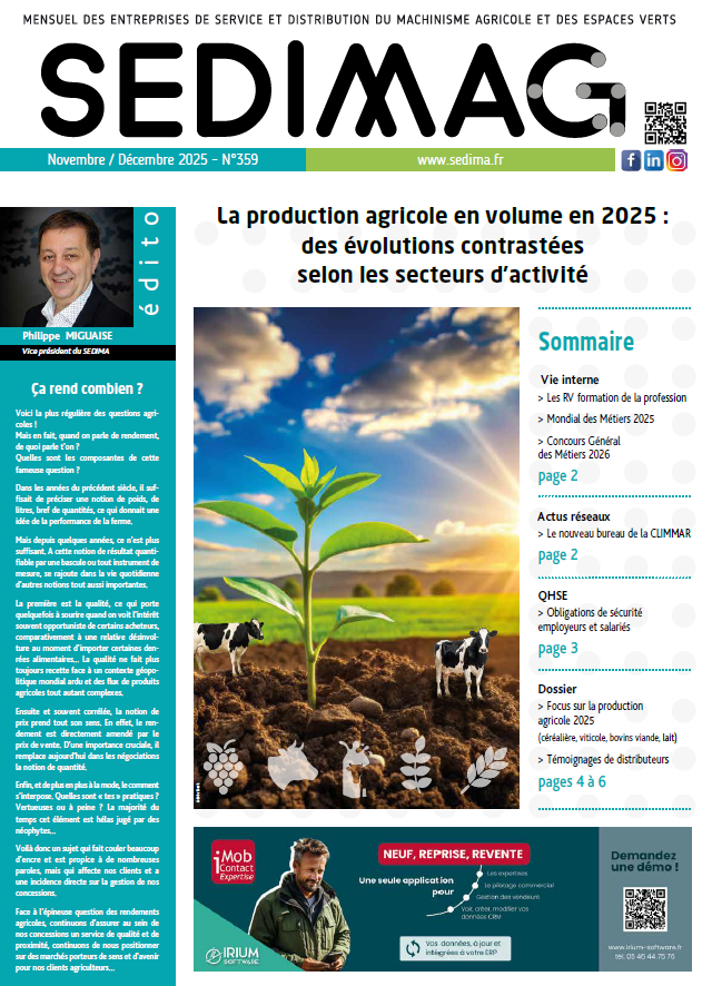 Le Sedimag relaie chaque mois l’actualité de la distribution du machinisme agricole et des espaces verts. Les adhérents du Sedima peuvent communiquer gratuitement dans le magazine. Pour une campagne publicitaire (payante),